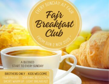 October 26, 2025 0 Comments Brothers Fajr Breakfast Club Brothers Fajr Breakfast ClubFrom Sun 2nd November at Fajr. Prayer – Quran Reflection – Short Warm up – Light Breakfast Read More