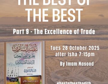October 26, 2025 0 Comments Part 9 – The Excellence of Trade Part 9 - The Excellence of TradeThe weekly reading of hadith will restart on Tuesday after Isha prayer 7:15pm. By Imam Masood Chowdhury – All Welcome! #bestofbesthadith Read More
