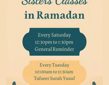 February 3, 2026 0 Comments Sisters Classes in Ramadan Sisters Classes in RamadanEvery Saturday 12.30pm to 1.30pm – General Reminder Every Tuesday 10:00am to 11:30am – Tafseer Surah Yusuf Read More