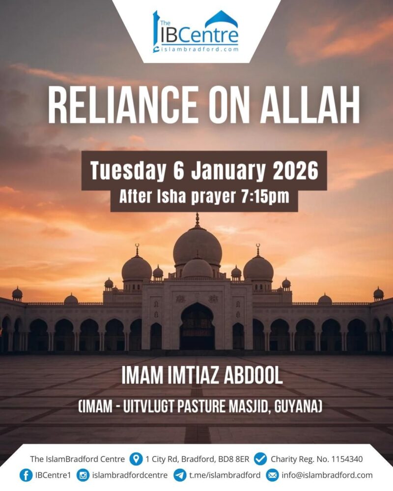 Uncategorized By Abdul Akhunzada January 5, 2026 0 Comments Reliance on AllahTuesday 6 January after ISHA prayer 7.15pm – by Imam Imtiaz Abdool of Guyana All Welcome!